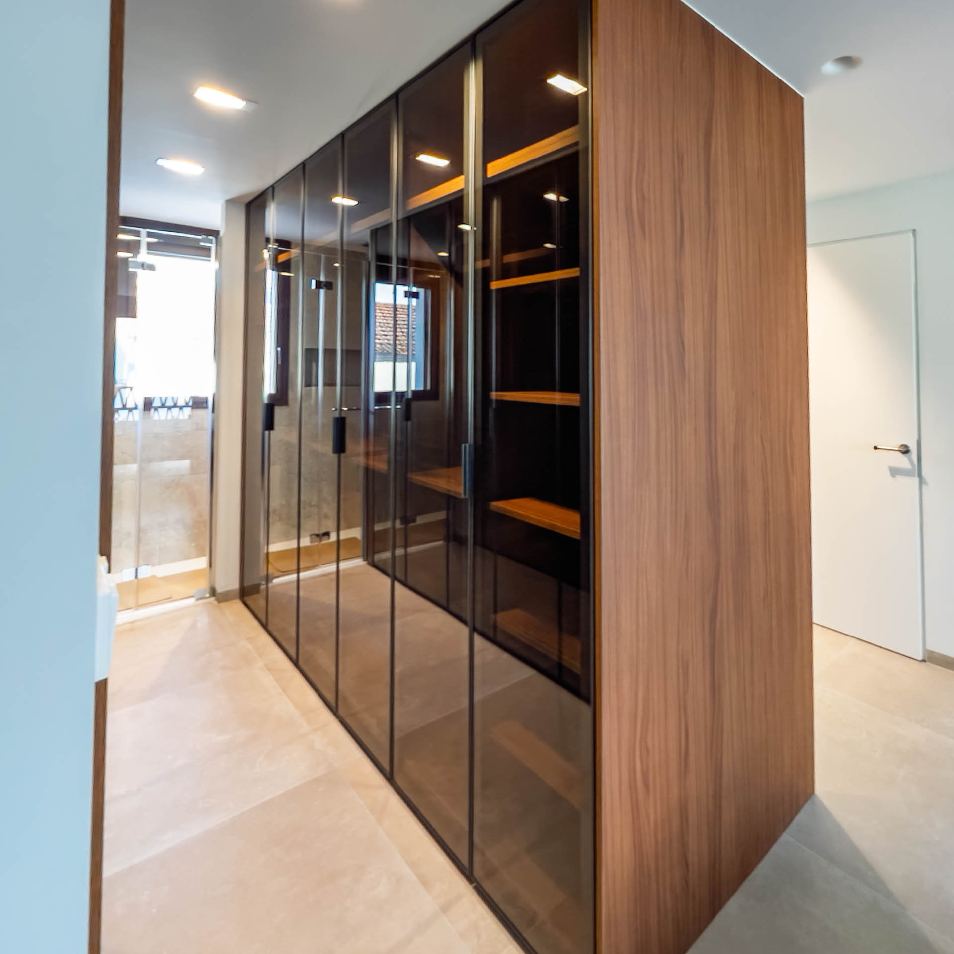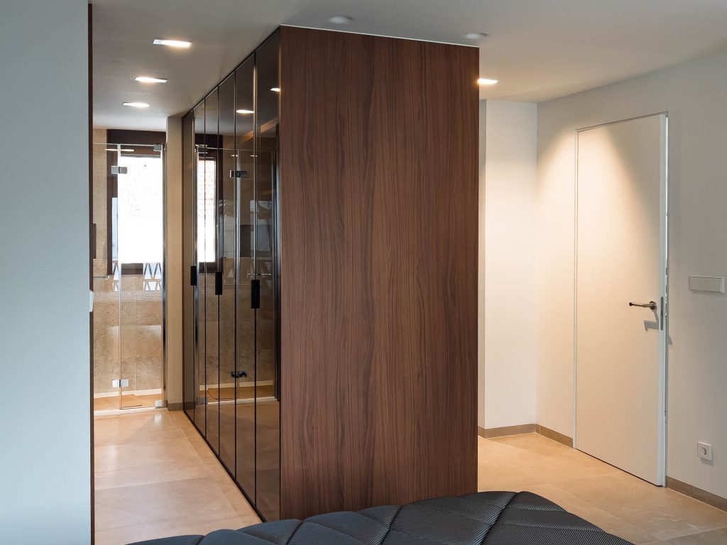 En el dormitorio principal, el vestido asumen un papel protagonista: sus frentes de vitrina con perfil metálico negro y cristal semitranslúcido invitan a descubrir un interior en cálido nogal, realzado por una iluminación LED estratégica.