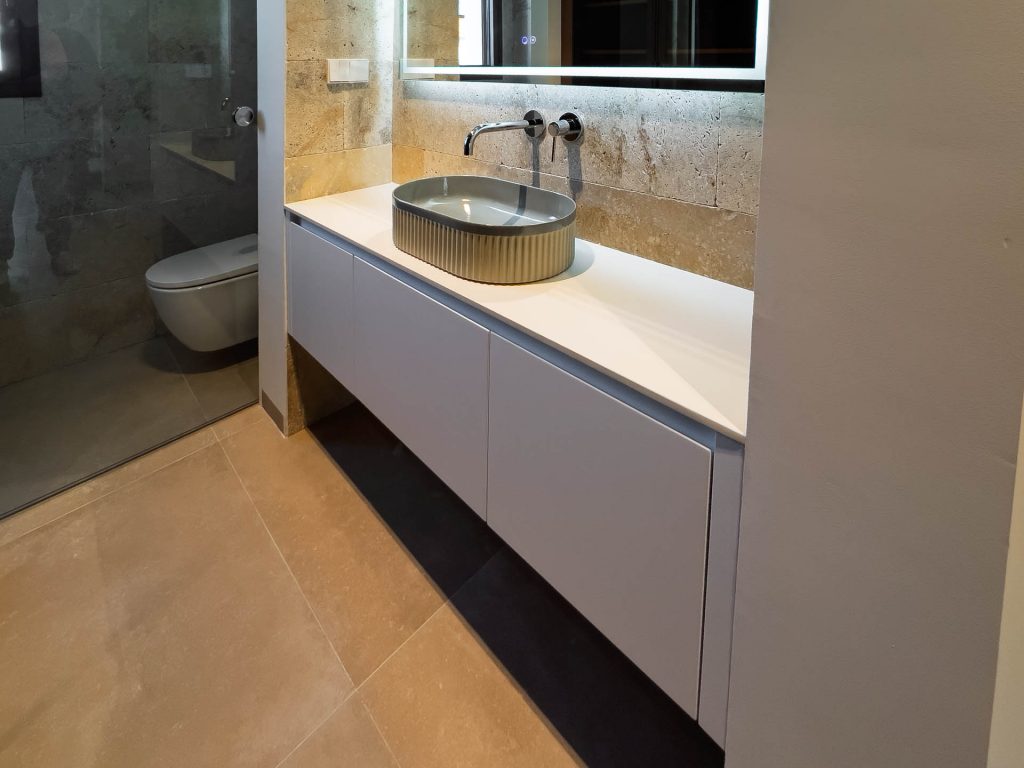 El baño principal destaca por sus tres módulos suspendidos que aportan ligereza visual y optimizan el espacio, combinados con una elegante encimera en porcelánico. La integración de la iluminación y la elección de materiales duraderos garantizan ambientes que invitan a la relajación y facilitan las rutinas diarias.