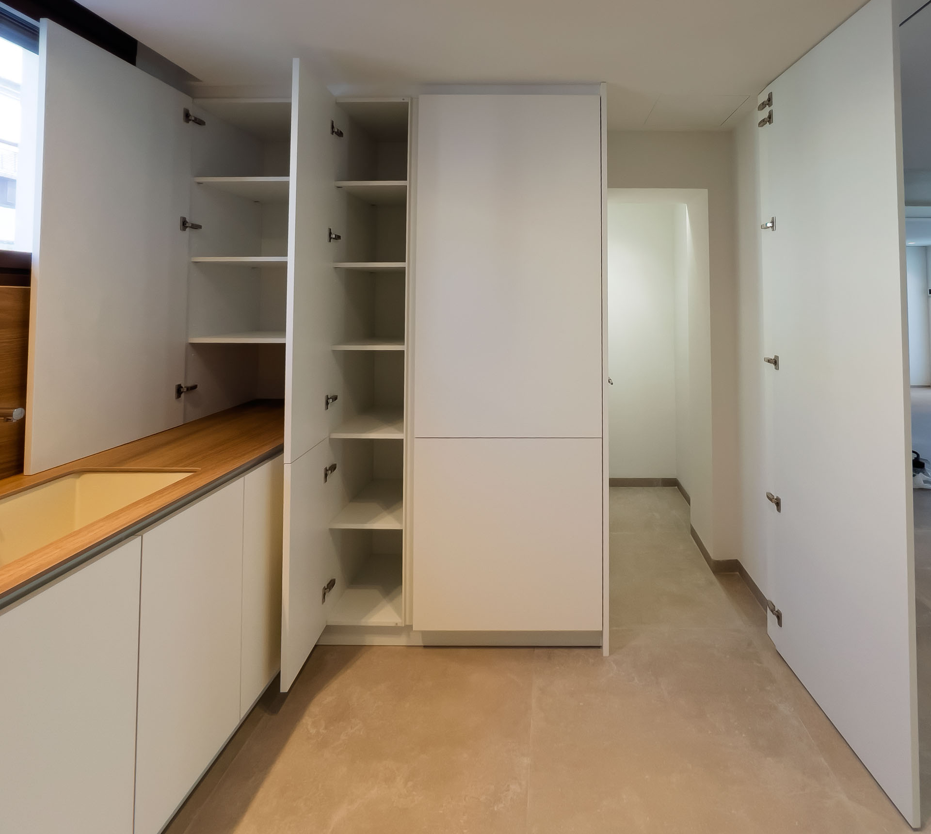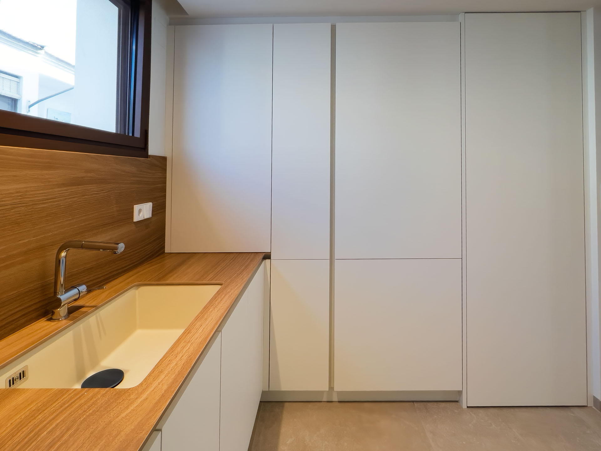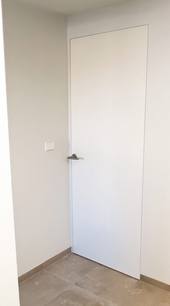 En este proyecto, hemos cuidado cada transición entre espacios. La instalación de puertas enrasadas lacadas en blanco ha sido clave para lograr una estética limpia y minimalista. Estas puertas, que se integran a la perfección en la pared sin molduras ni marcos visibles, crean una sensación de continuidad y amplitud, permitiendo que la luz fluya y que el diseño interior gane protagonismo. Es un detalle de alta carpintería que aporta funcionalidad, elegancia y un acabado impecable.t