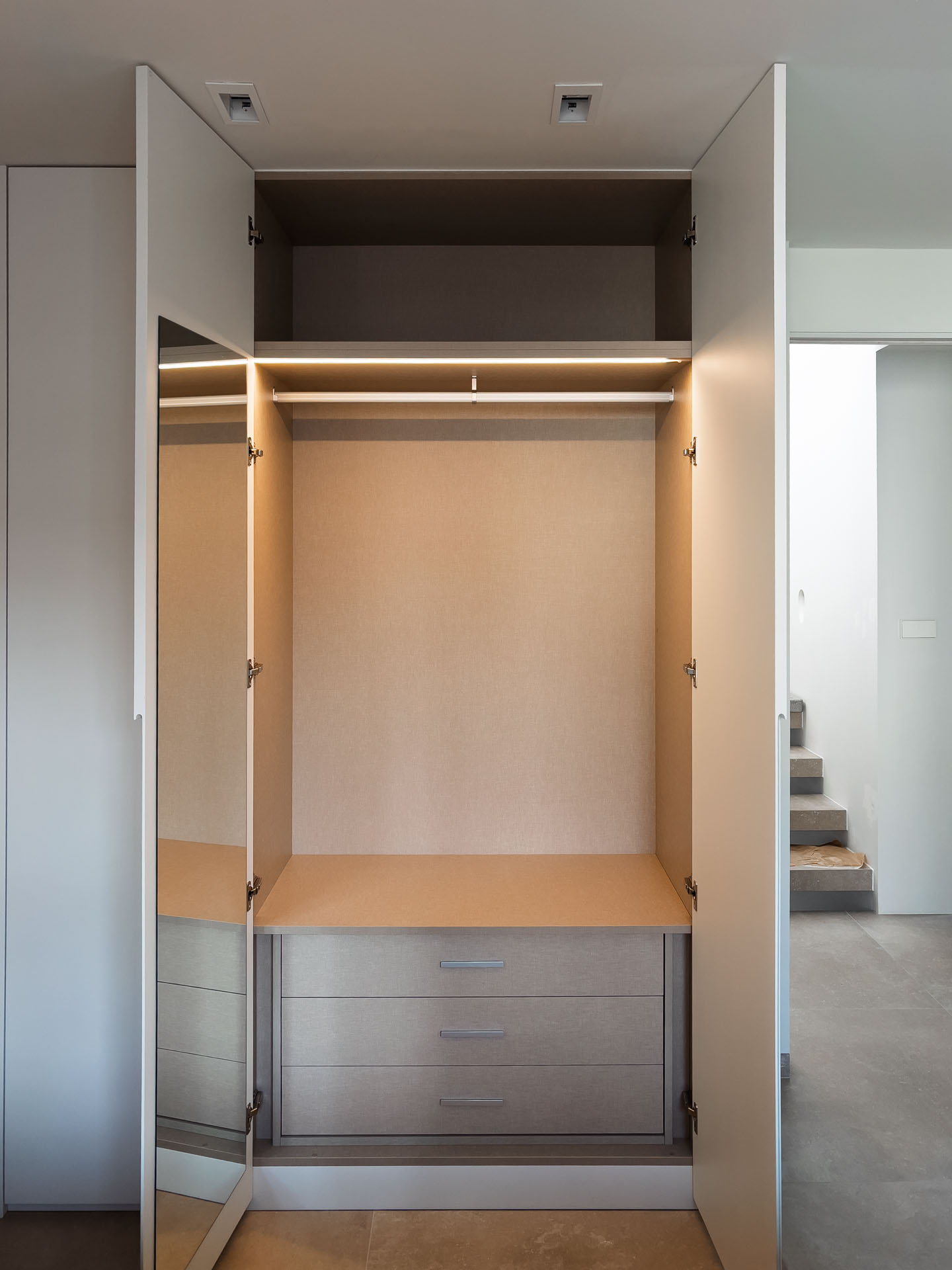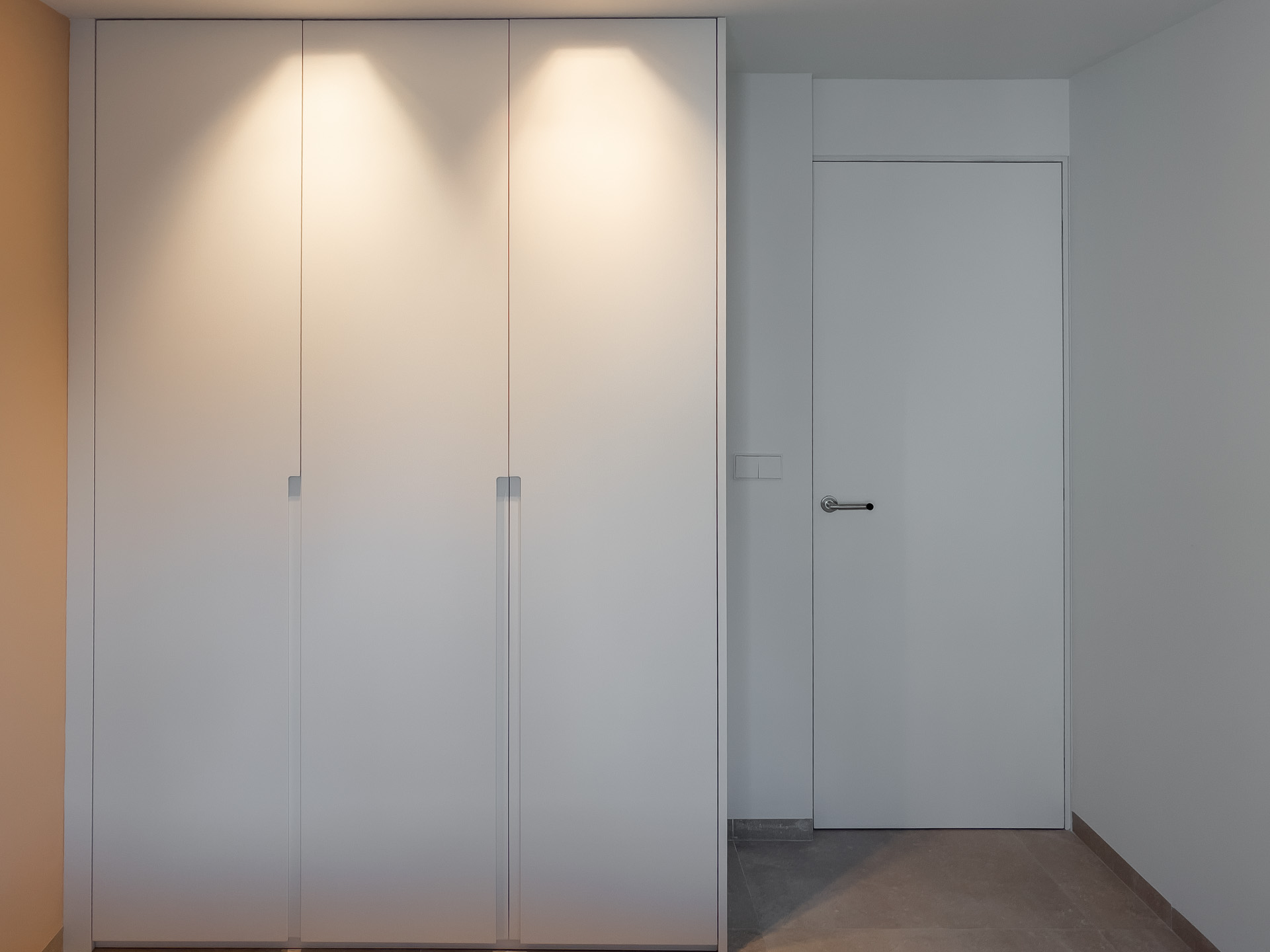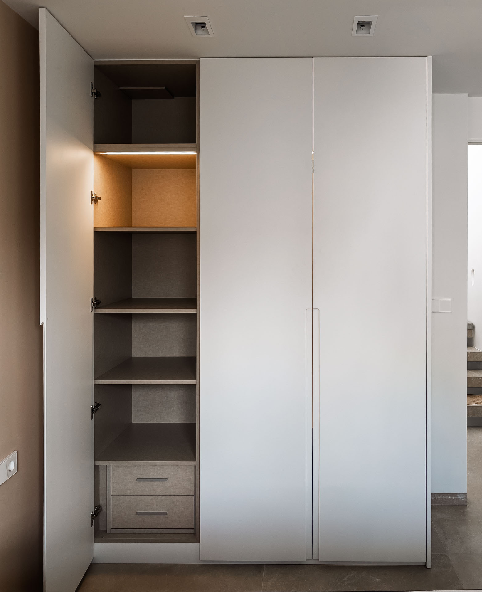 Los armarios, en un elegante lacado blanco mate, ofrecen interiores organizados con una suave luz LED que revela un acogedor acabado textil.