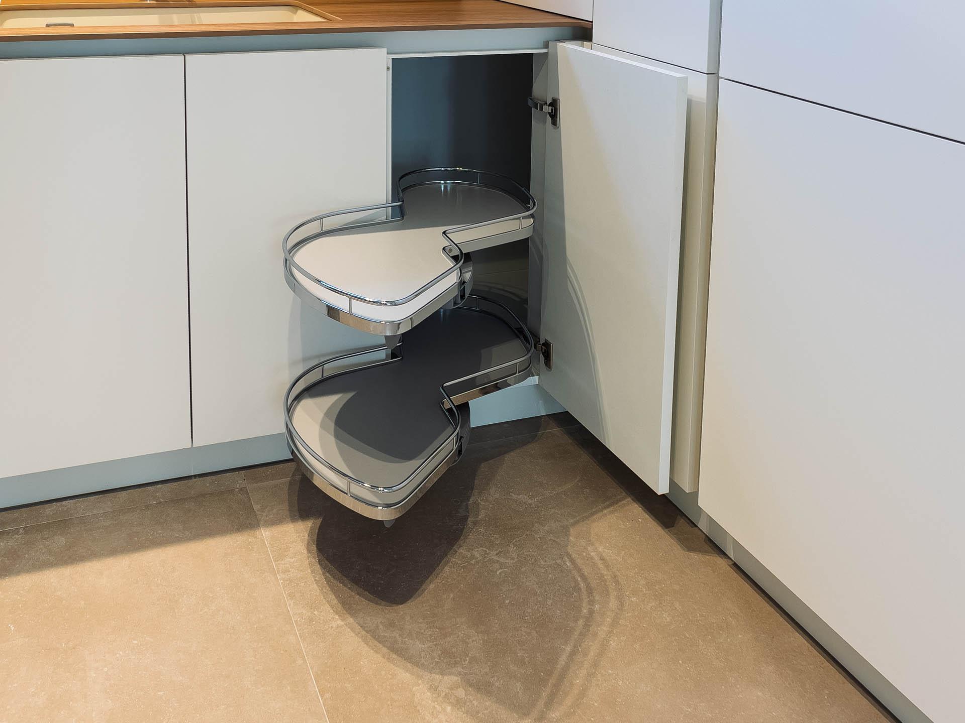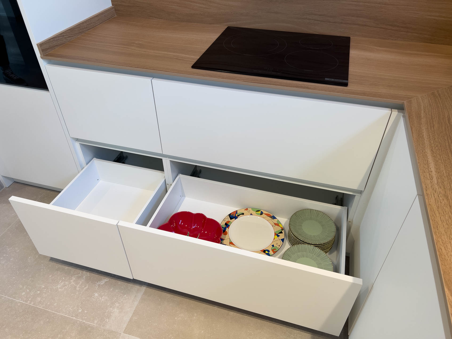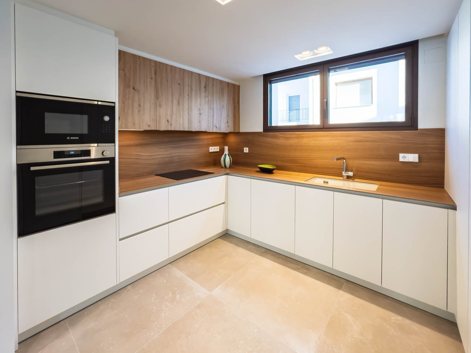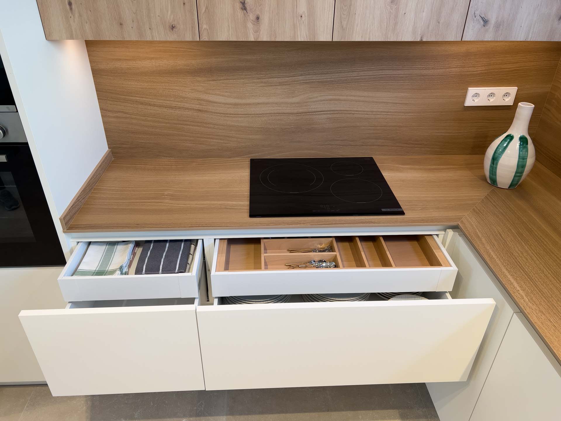 Esta cocina se presenta como el verdadero centro neurálgico de la vivienda. Con un diseño que combina la suavidad de los tonos claros y acabados sedosos con una organización inteligente, cada elemento invita a disfrutar. Hemos integrado soluciones que facilitan el día a día, como rincones de almacenamiento inteligentes y electrodomésticos perfectamente disimulados.